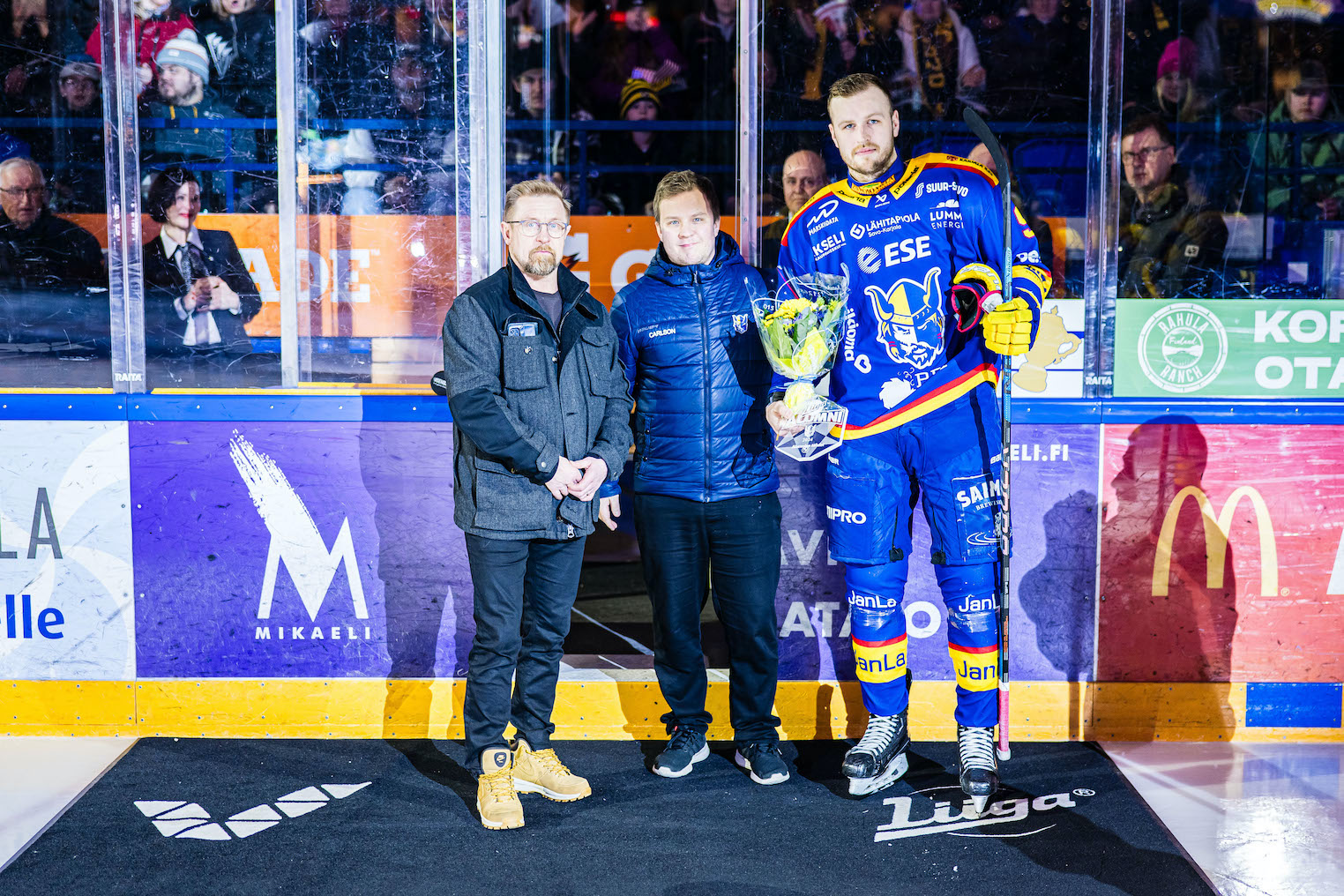 Kaudella 2024-2025 Jukurien Alumnien Tähti oli Mathieu Herpin. Maalivahtia palkitsemassa Jukka Penttinen