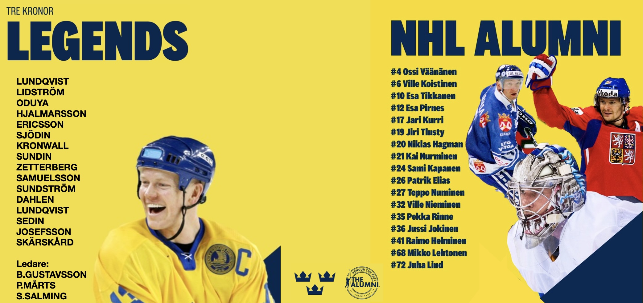 Perjantaina 7. helmikuuta. Avicii Arenalla Tre Kronor Legendat kohtaavat NHL Alumnin jolla on vahva eurooppalainen edustus. Tre Kronor Legendojen joukkueessa pelaavat mm. Mats Sundin, Niclas Lidström, Henrik Zetterberg ja Henrik Lundqvist. Suomesta mukana NHL Alumnin joukkueessa ovat mm. Jari Kurri, Esa Tikkanen, Teppo Numminen ja Pekka Rinne. Joukkueet täydentyvät vielä ja ne esitellään lähempänä tapahtumaa. Tapahtuman tuotto menee Börje Salming ALS-säätiölle sekä NHL Alumni -yhdistyksen eri projekteihin, jotka keskittyvät entisten NHL-pelaajien mielenterveys ja hyvinvoinnin parantamiseen.